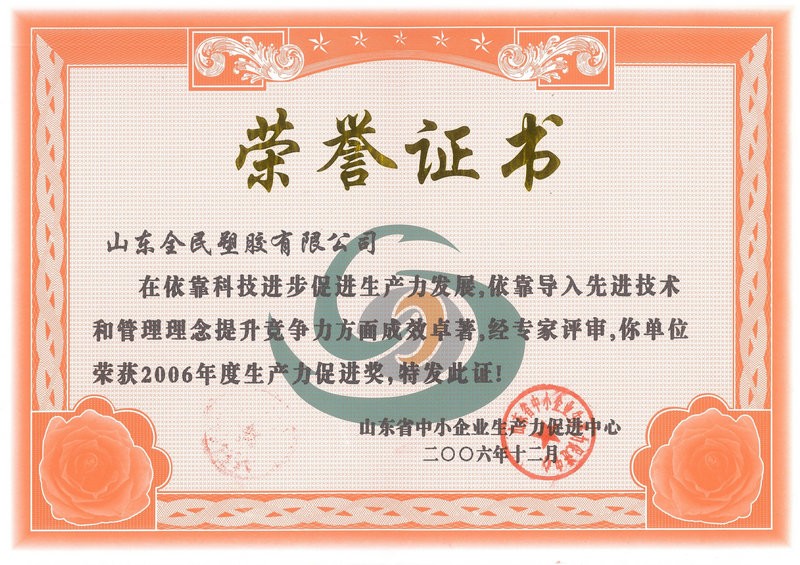 省級生產(chǎn)力促進(jìn)獎榮譽(yù)證書2006.12